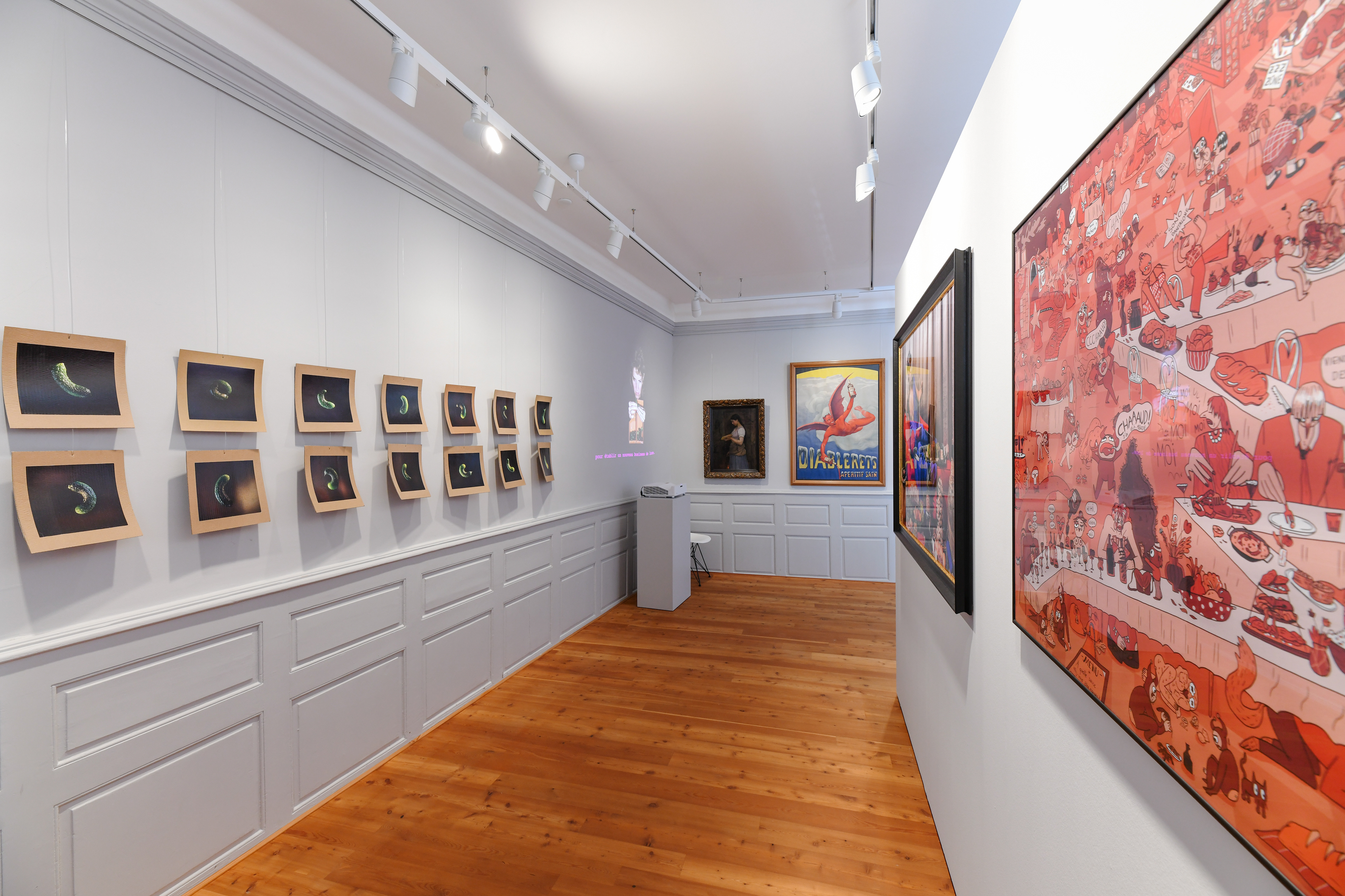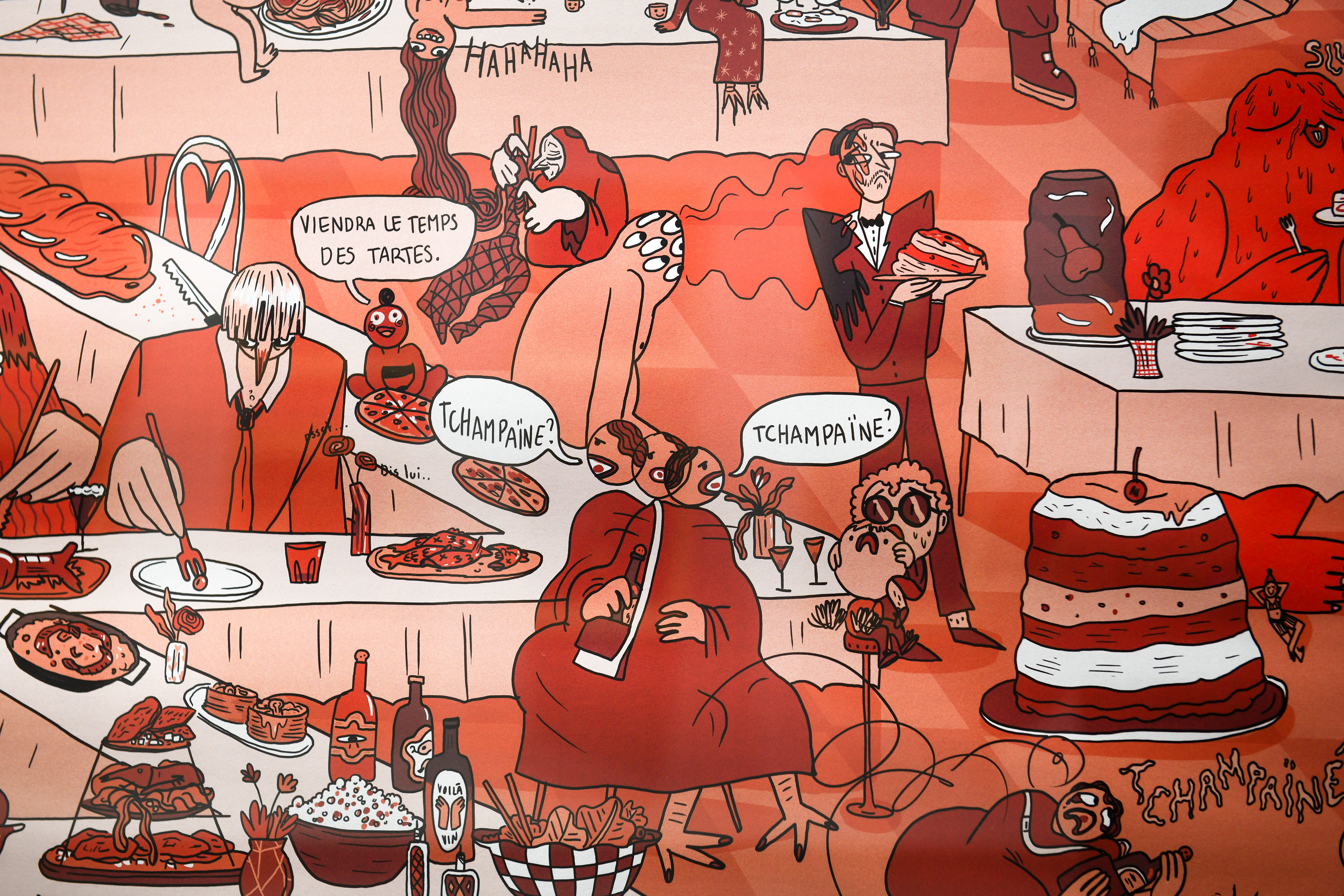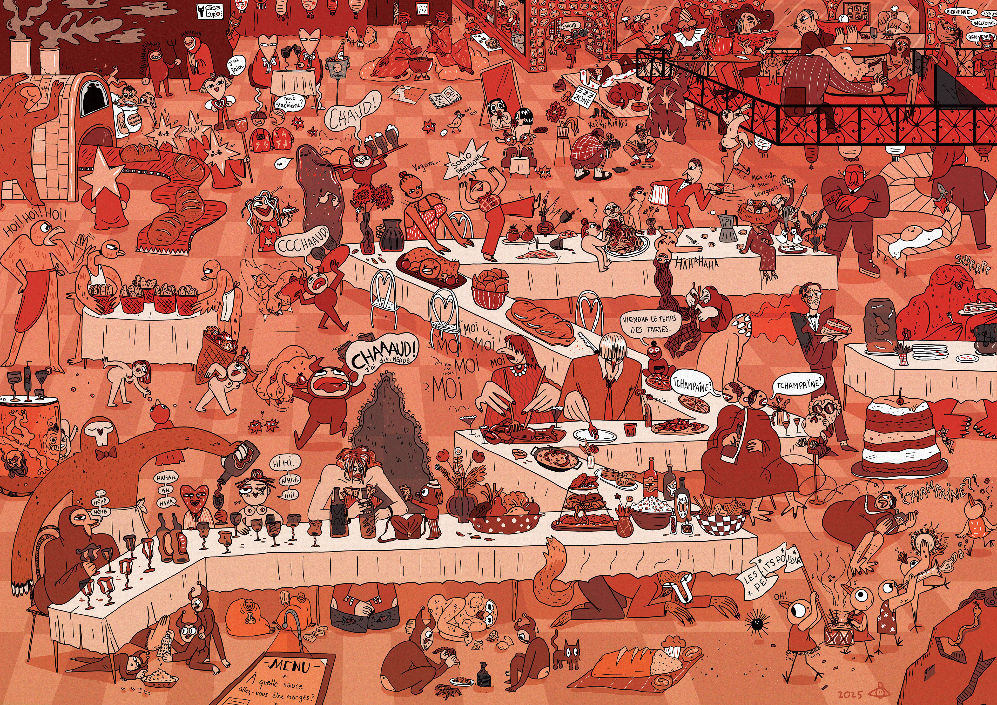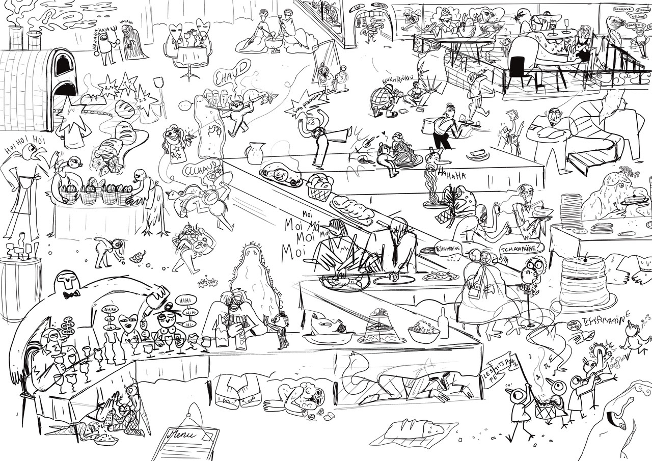 My A0 illustration portrays a lively banquet scene filled with strange creatures, drunken monsters, and countless small stories unfolding throughout. I wanted viewers to immerse themselves in the drawing, discovering new details and narratives each time they look at it. To be discovered at the Espace Graffenried in Aigle until 08.03.26.